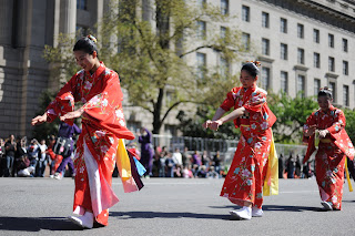 Finally, after years of living in the D.C. area, I made it to the city's cherry blossom parade and Japanese street festival. The parade reminded me of the one on the Fourth of July (there were some familiar balloons), but who doesn't like watching the colorful floats and listening to the bands as they march past? It also gave me a chance to use my new camera. It was quite an upgrade, so I'm still getting used to the differences. But already I love the improvement in picture color and clarity.